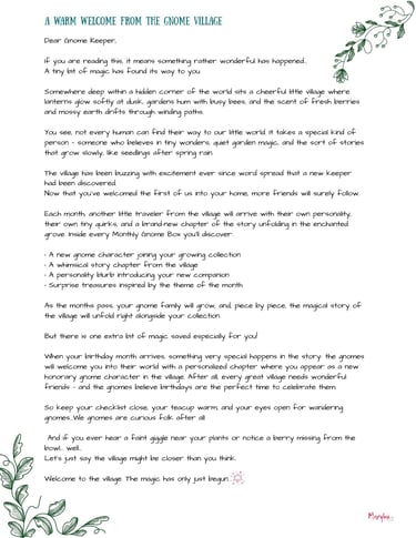 Become a Gnome Keeper and welcome a traveling gnome into your care each month, along with a whimsical story chapter and delightful surprises from the village.